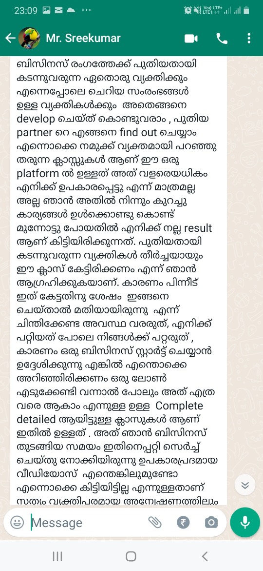 "HiI am shyamdeep Moorkoth,Director Ryzen Intels Mind Pvt Ltd.On my journey to accure knowledge on the modern buisiness process,came across,with Master class provided by Mr.Rakesh.Initialy i enrolled for base class and find it very usefull.then i registered to Masterclass which gave me more insight,and dynamic tools for building micro concepts in todays buisiness world.Intelligently incorporated with NLP principles,with proven steps for building the buisiness,were very well explained by My Mentor Mr.Rakesh.Defenitely its a great platform to learn,collaborate,and grow together with like minded personalities.Finding a real partner,understanding the matket,identifying our capabilities,overcomming challenges through NLP based technics,scaling the buisiness to next level globaly are few highlights of the course.Most of the buisiness fail due to lack of knowledge. proper mentoring is the key to the success.I am sure Mr.Rakesh is on right track for building a strong buisiness community in kerala.I am gratefull to him for his efforts and continuous communication for lifting us to the way forward.strongly recommend this master course to aspiring buisiness enterprenueres,BBA,& MBA students.Its realy worth investing on this course.All the best👌🏻"